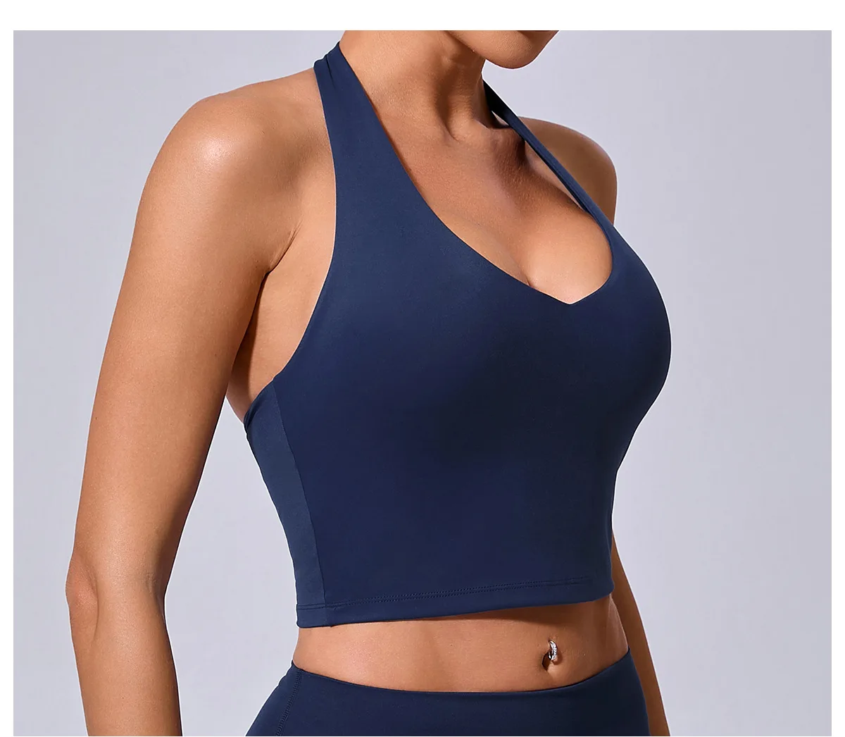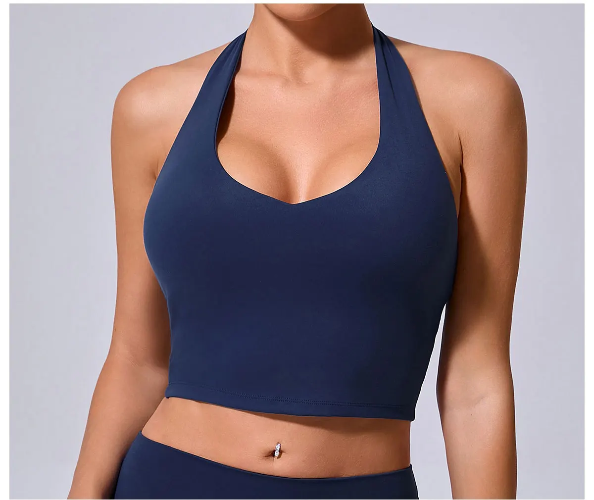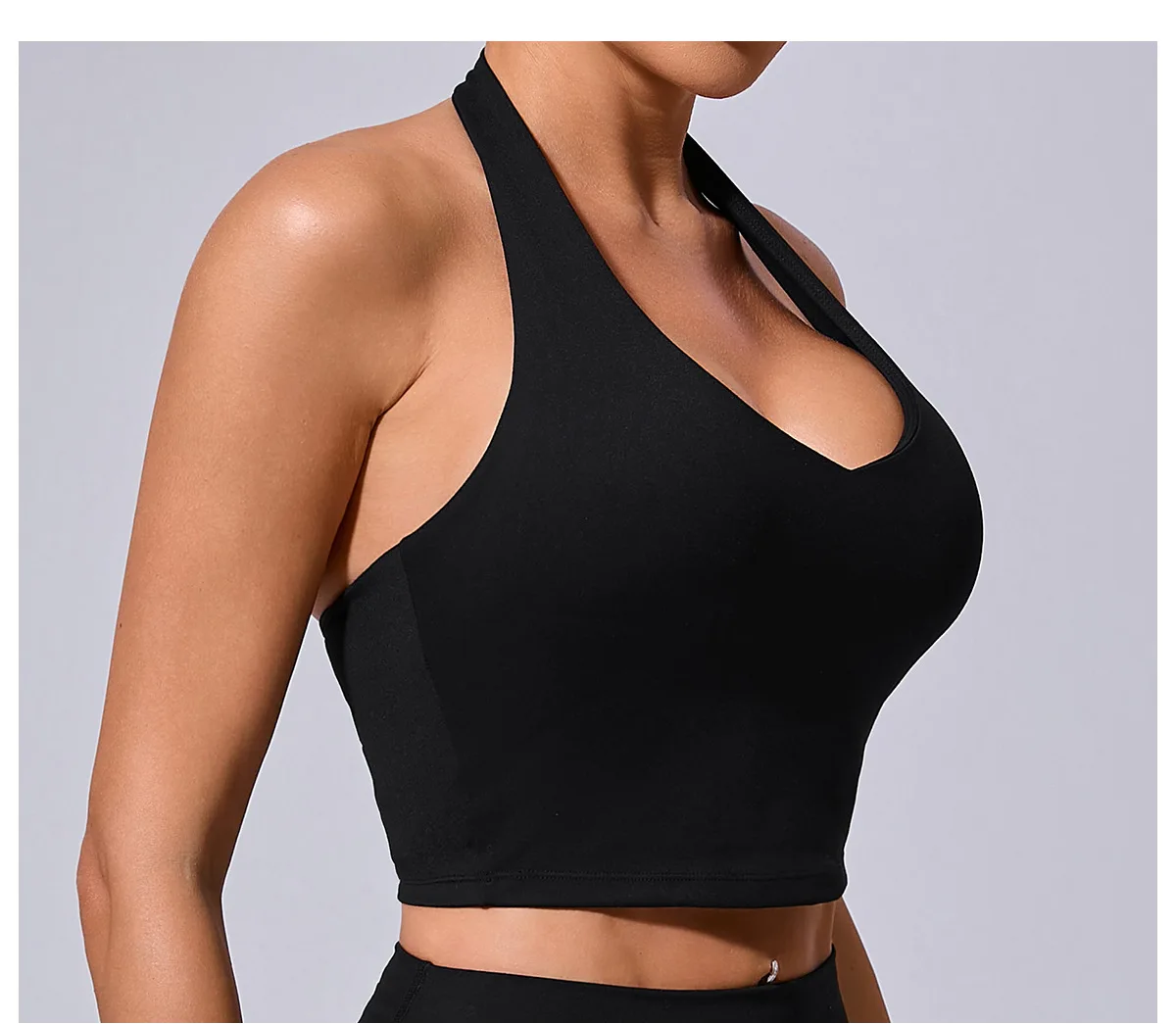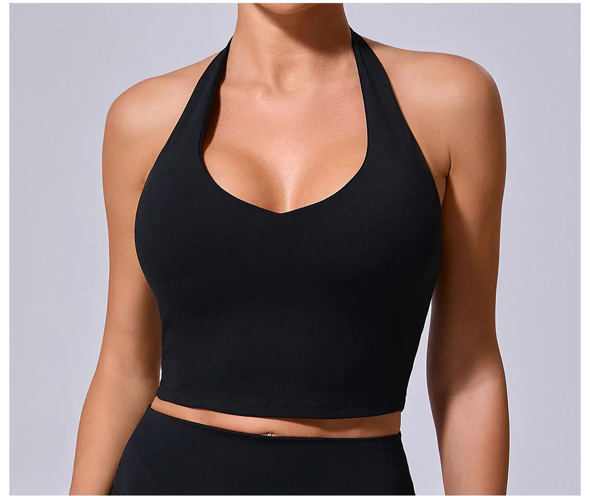 Enjoy a sleek and supportive fit with this halter neck yoga sports bra, designed for maximum comfort and freedom of movement.