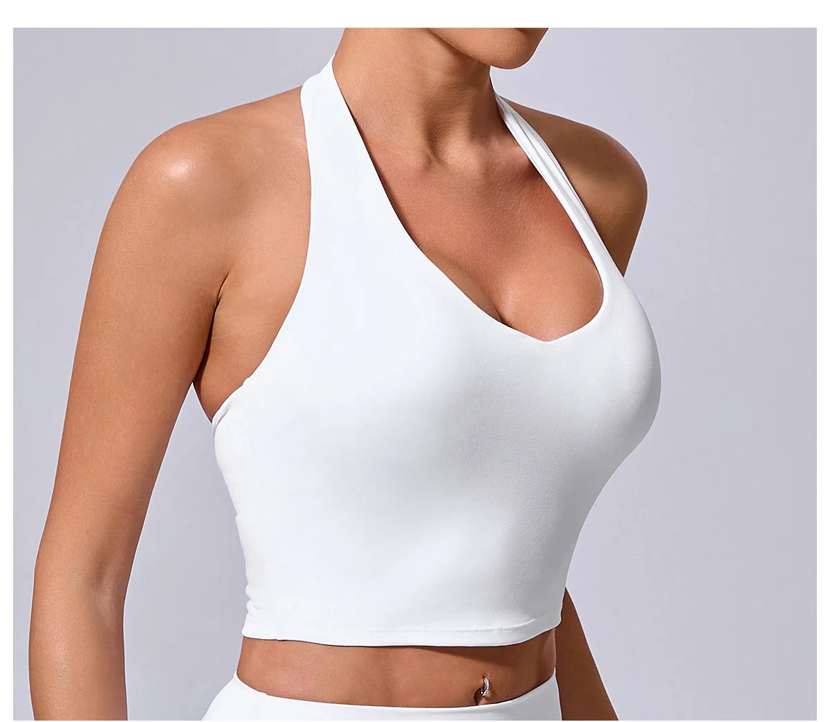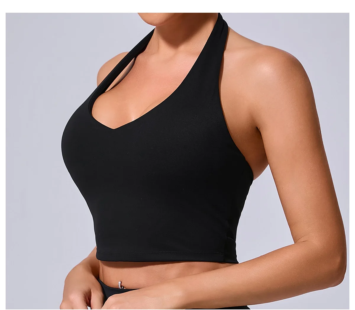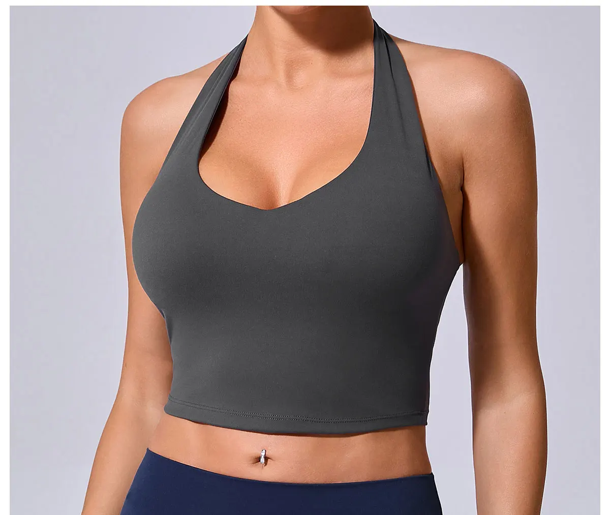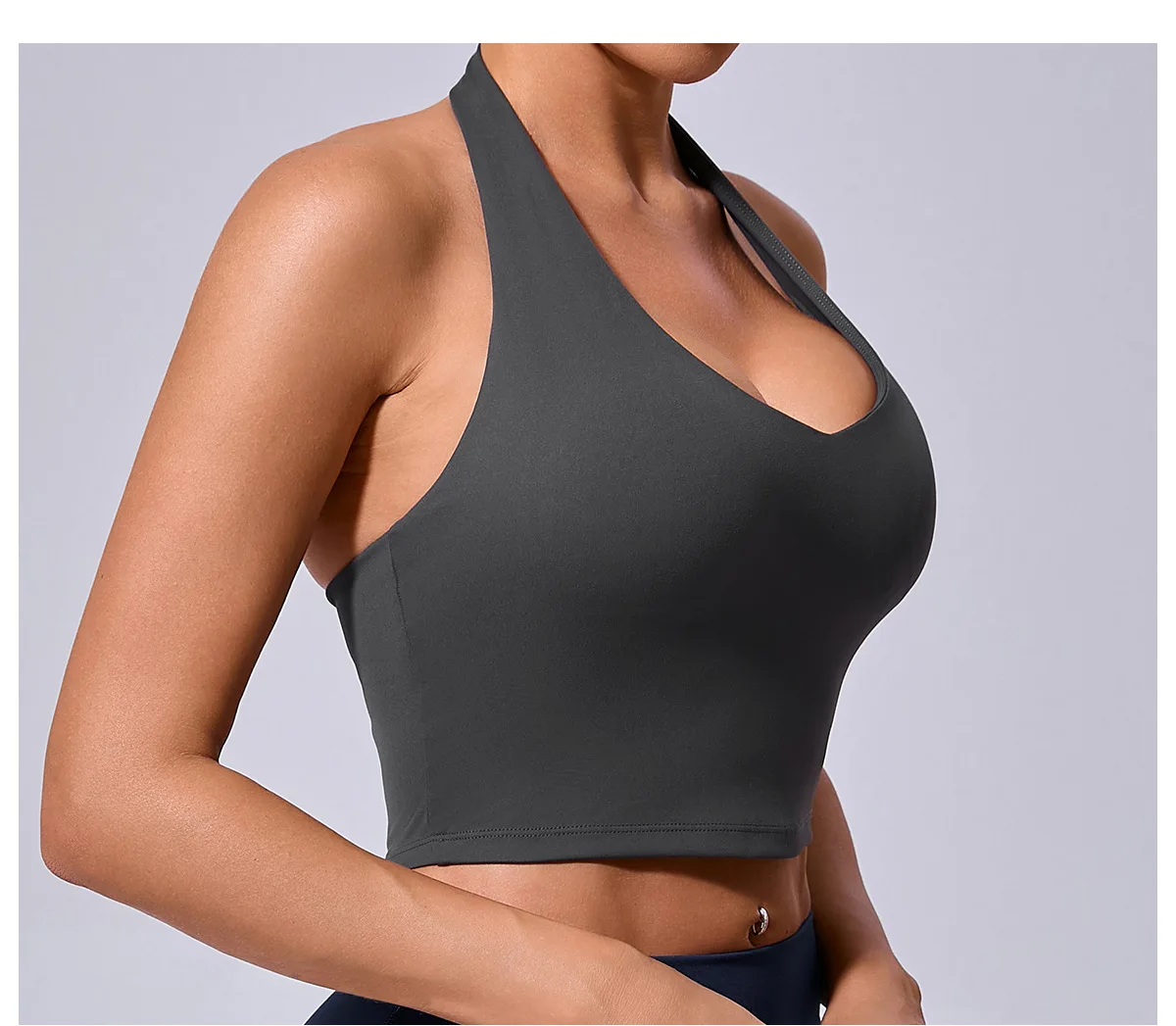 Enjoy a sleek and supportive fit with this halter neck yoga sports bra, designed for maximum comfort and freedom of movement.