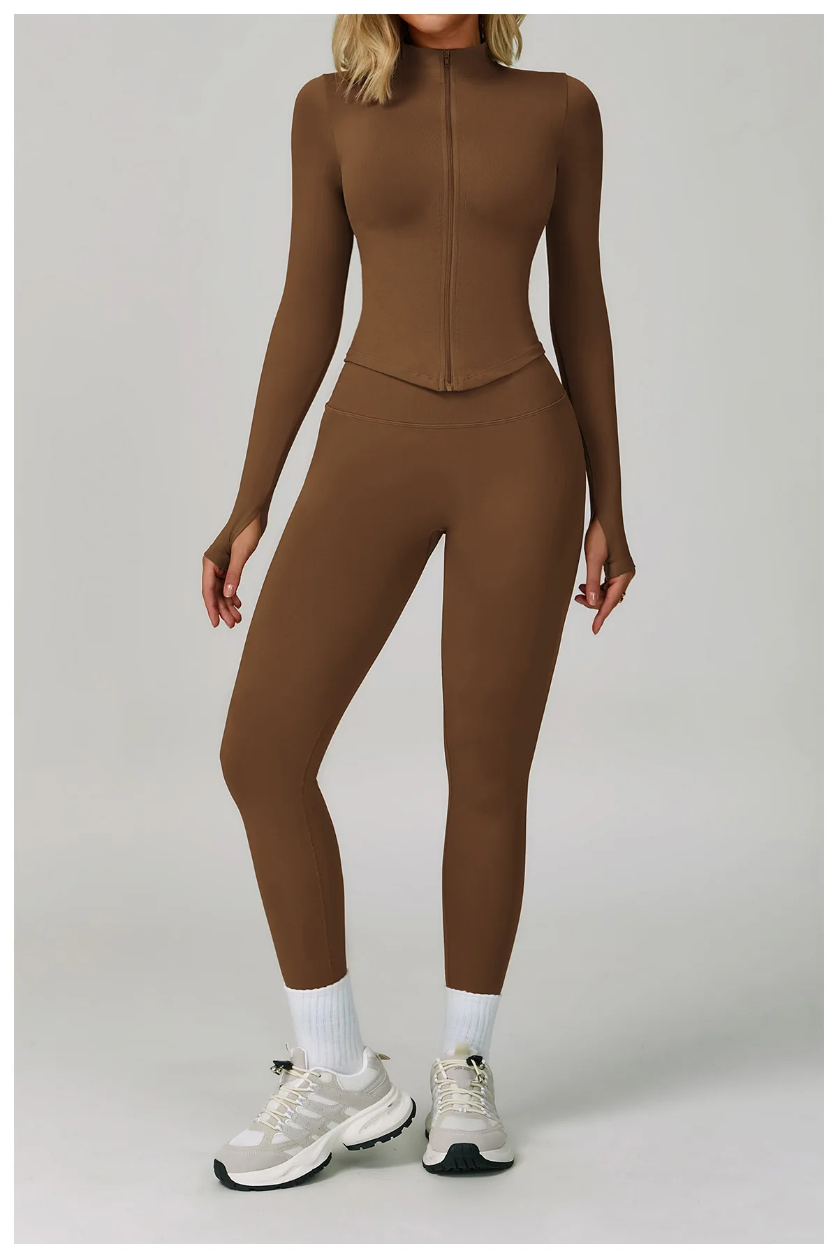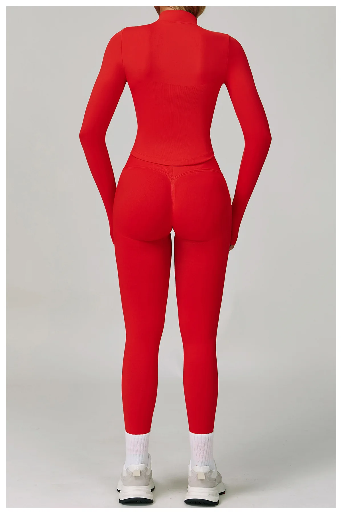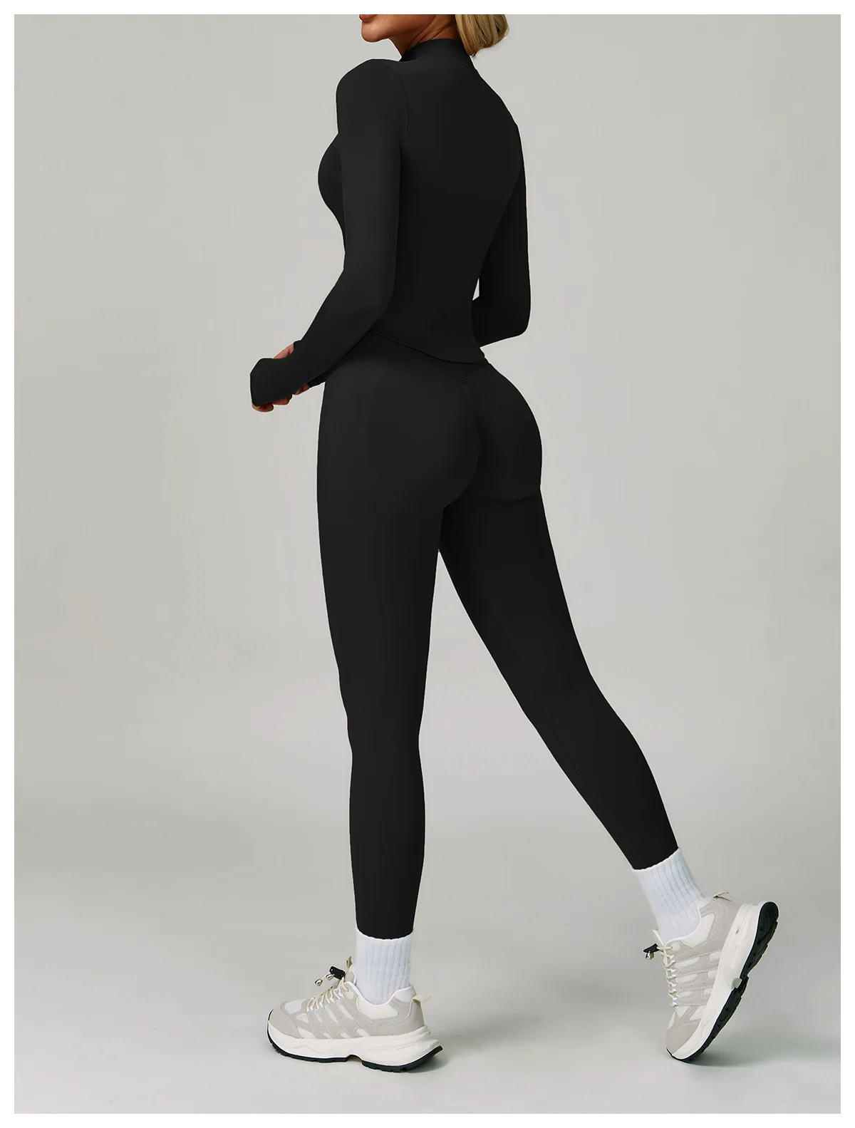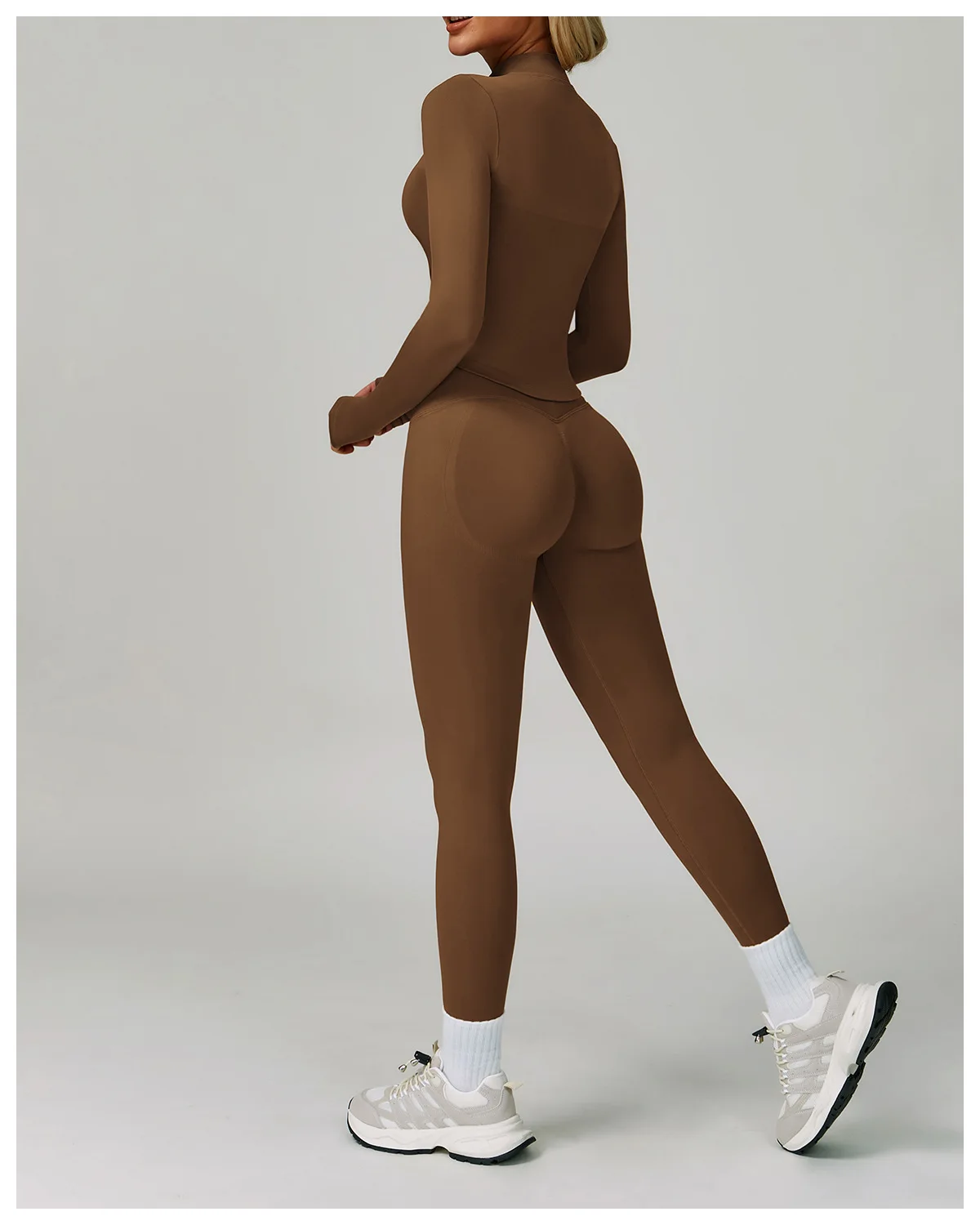 A high-performance two-piece set designed to shape, support, and enhance every workout. The seamless long-sleeve top offers a sculpting fit with full flexibility, while the high-waist leggings provide firm compression and a flattering silhouette.