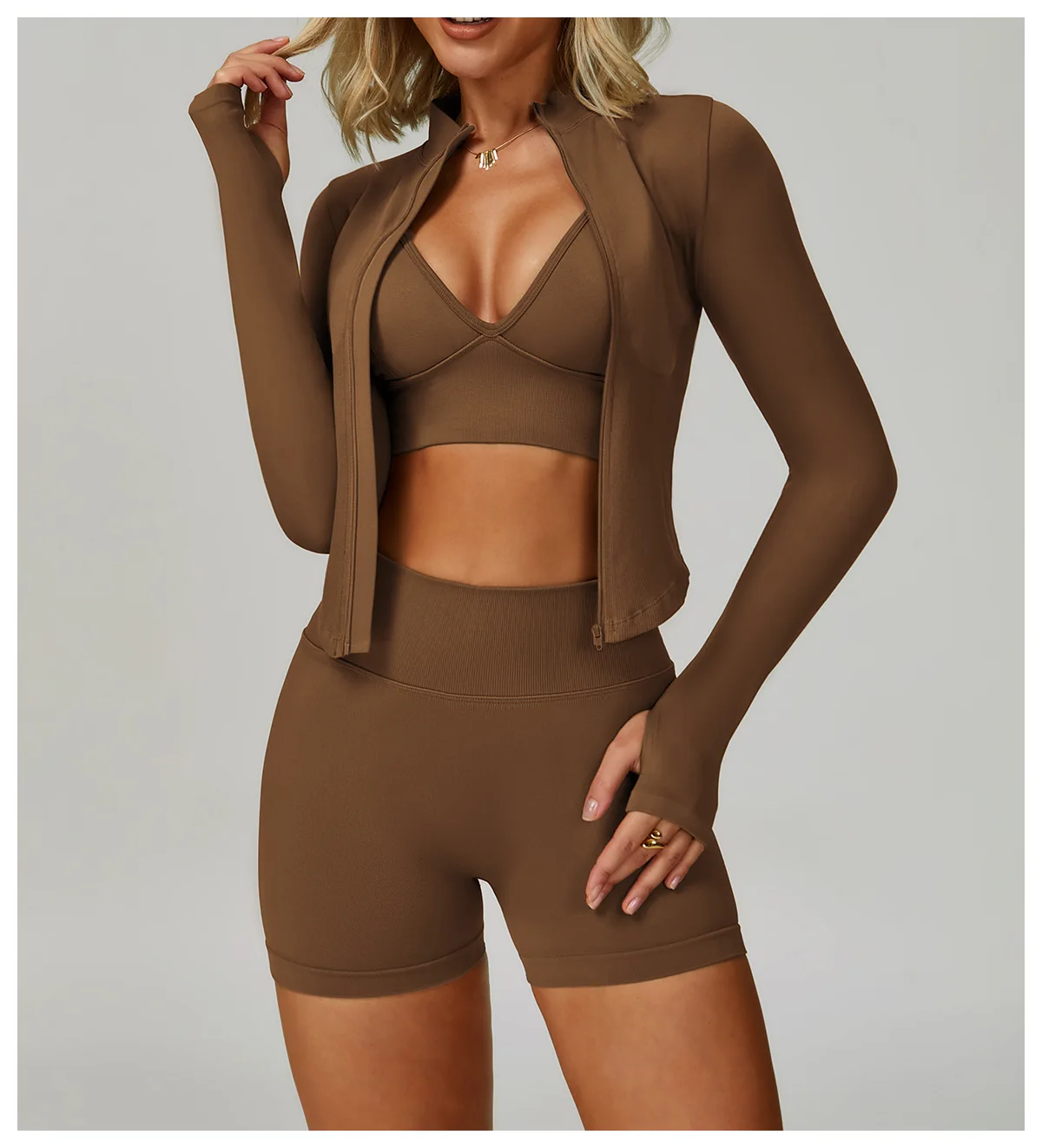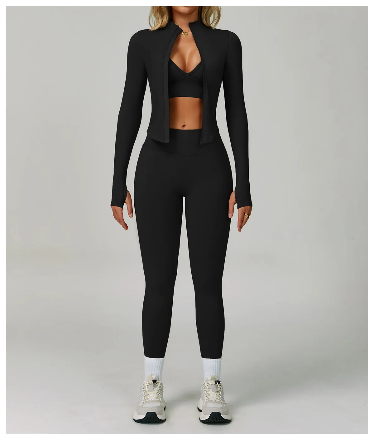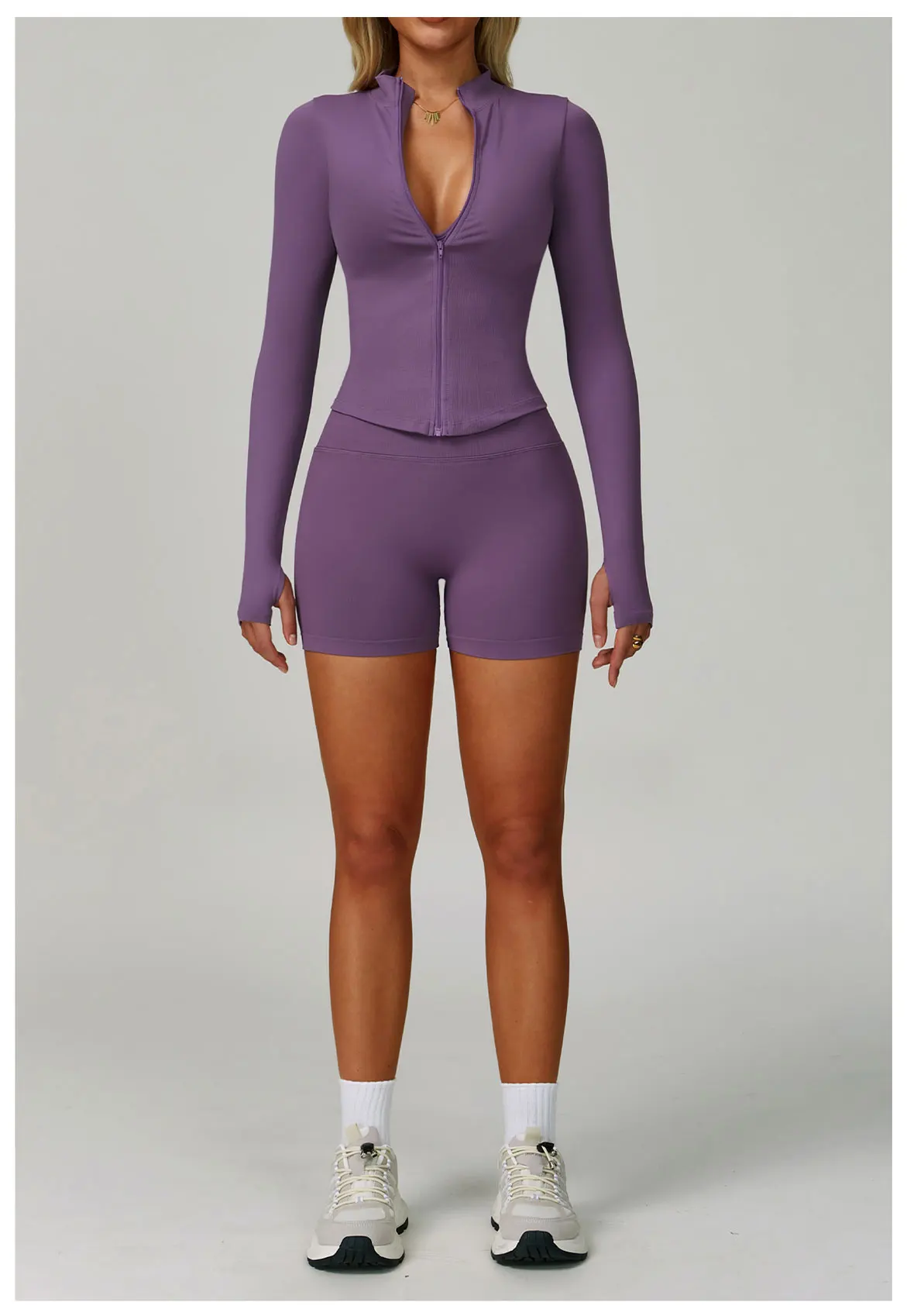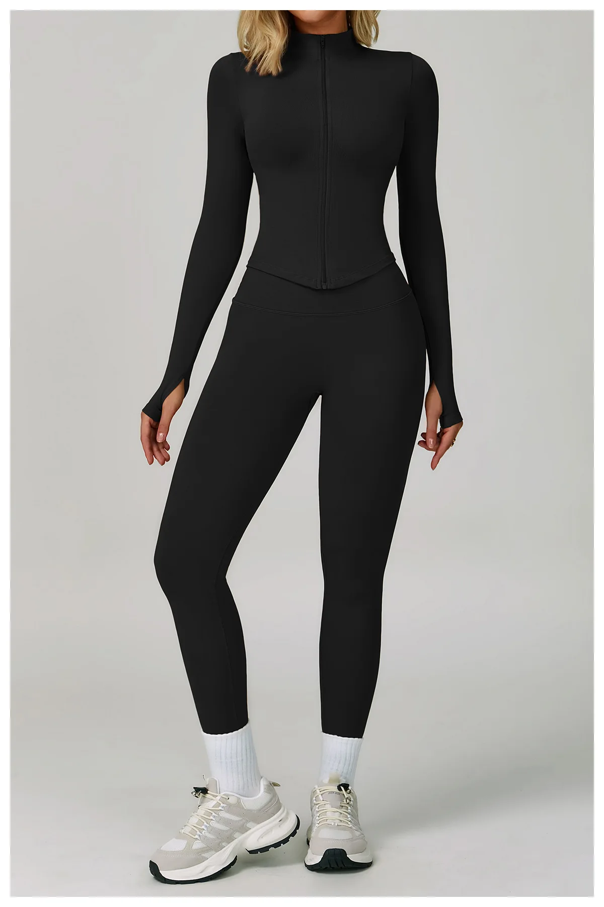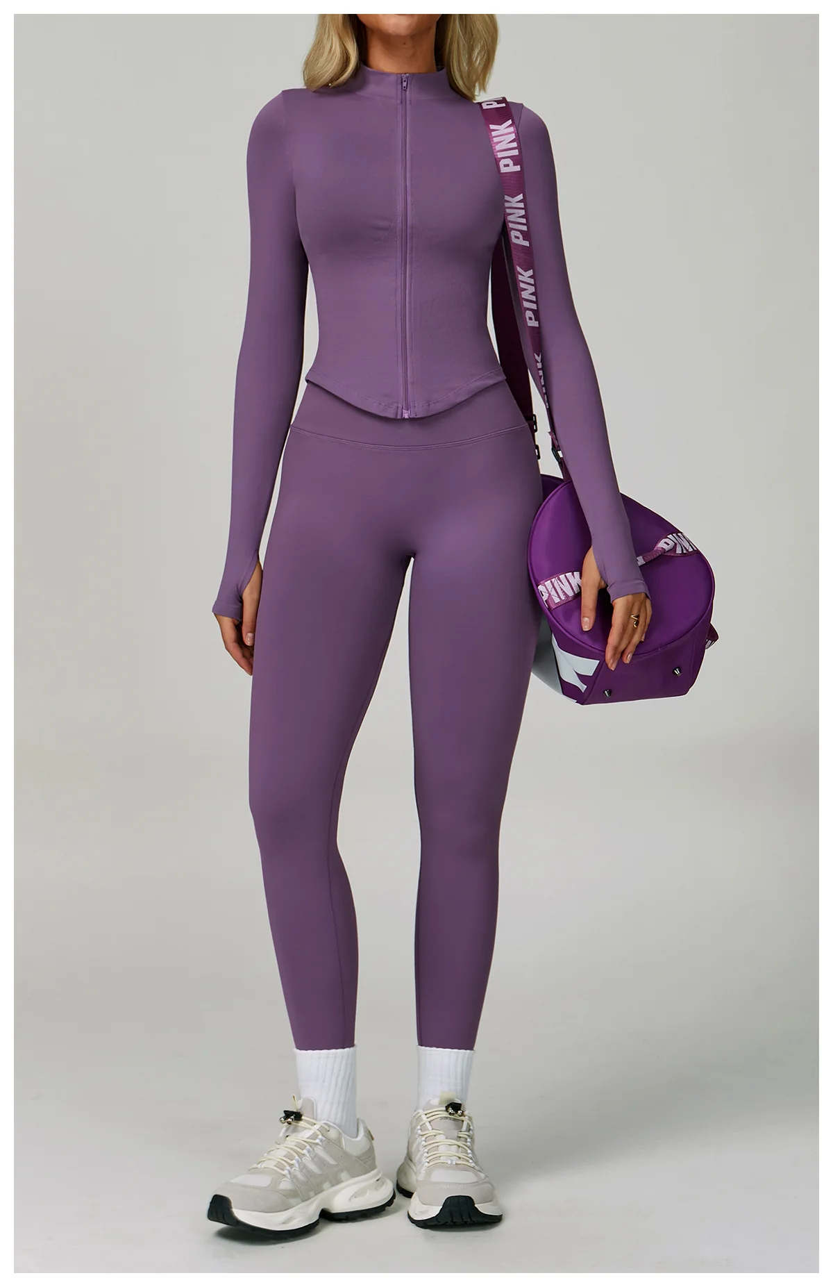 A high-performance two-piece set designed to shape, support, and enhance every workout. The seamless long-sleeve top offers a sculpting fit with full flexibility, while the high-waist leggings provide firm compression and a flattering silhouette.